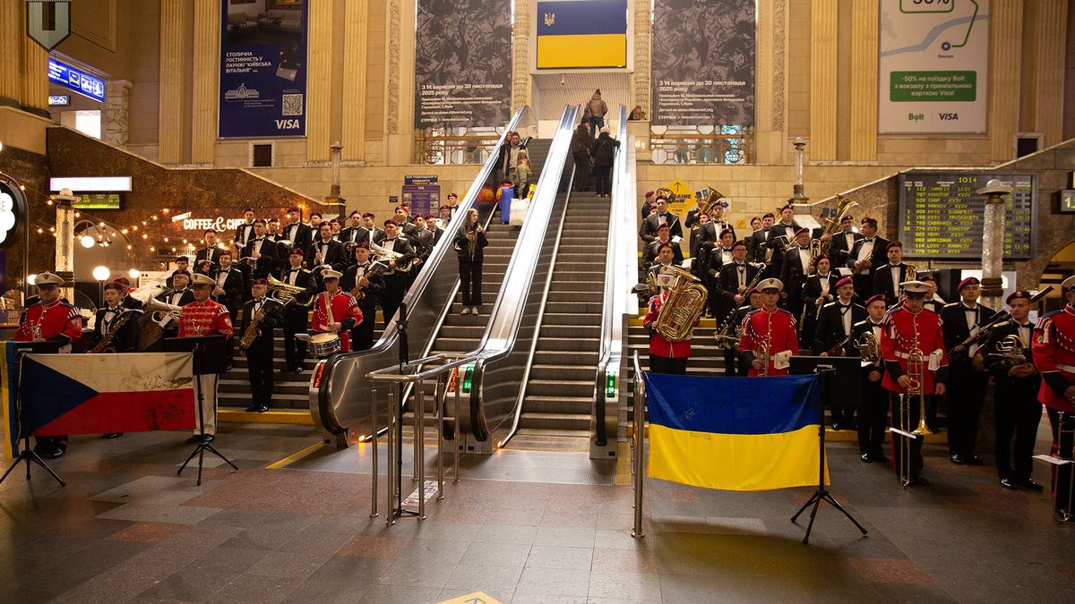 Na hlavním nádraží v Kyjevě v neděli vystoupil český i ukrajinský prezidentský orchestr, společně zahrály státní hymny obou zemí a také Ódu na radost, která je oficiální hymnou Evropské unie. Pořadatelé akce na místě také vystavili vlajku potřísněnou krví lidí zabitých při sovětské okupaci Československa v roce 1968.