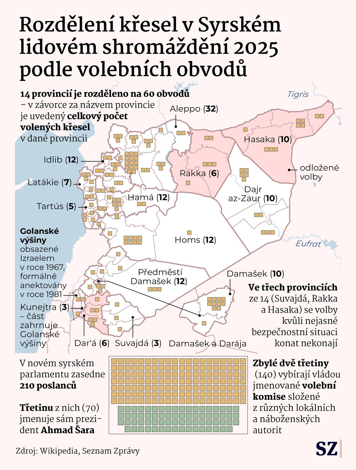 Místní výbory v Sýrii v neděli volily část členů přechodného parlamentu. Kritici ale proces považují za nedemokratický, uvedla agentura AFP. Prozatímní prezident Ahmad Šara má podle pravidel jmenovat 70 poslanců 210členného parlamentu, zatímco zbylé dvě třetiny poslanců mají vybrat právě místní výbory. Ty však určila volební komise, kterou jmenoval opět Šara.