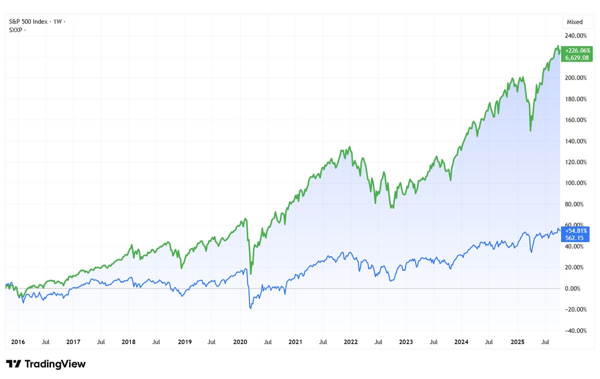 Index Stoxx 600 nakonec tento měsíc zaznamenal rekord, ale sotva drží krok s americkým indexem S&P 500.