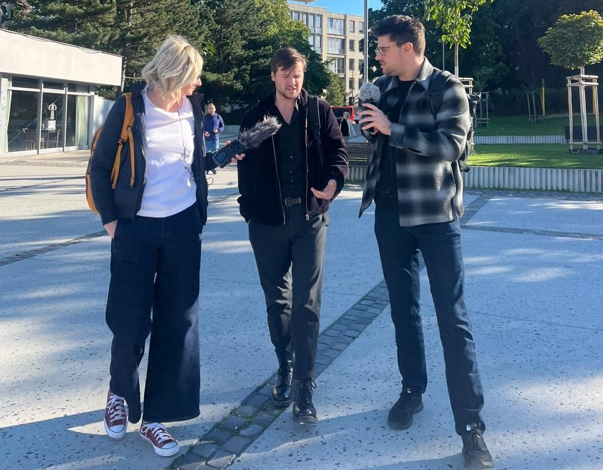 Editorka Barbora Sochorová, sociolog Dominik Želinský a reportér Filip Harzer při natáčení rozhovoru na bratislavském Náměstí svobody.