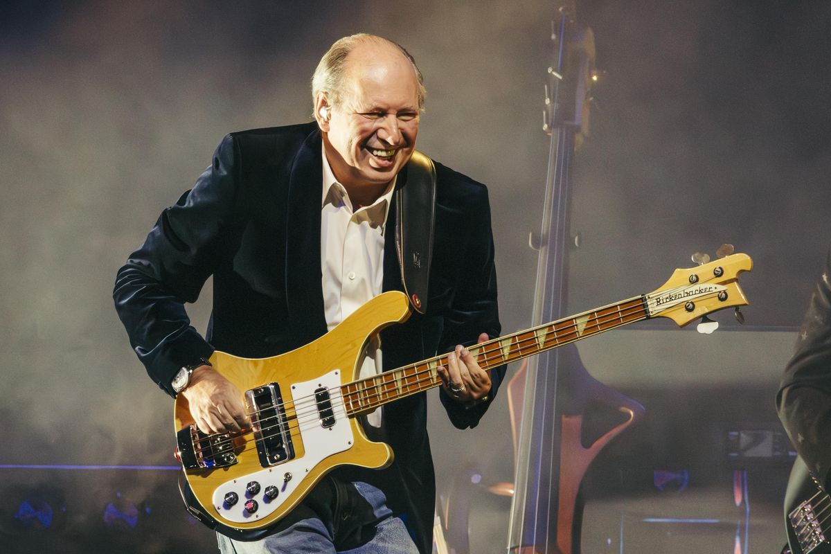 Také v Praze hrál Hans Zimmer chvíli na baskytaru Rickenbacker. Fotografie pochází z říjnového koncertu v Berlíně.