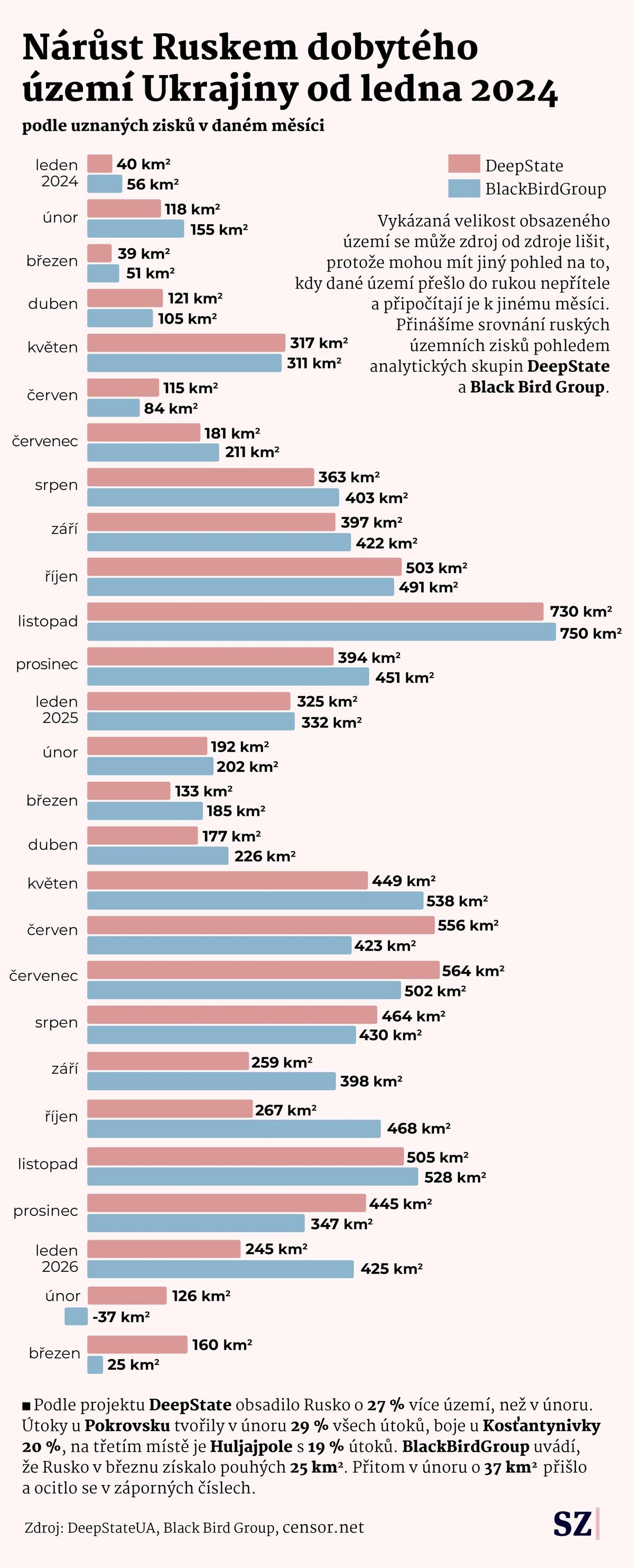 Březnové číslo představuje meziroční nárůst o 40 procent a navzdory obvyklému sezonnímu poklesu oproti zimním měsícům zůstává čtvrtým nejvyšším od začátku sledování. Poměr mezi územními zisky a ztrátami – desítky kilometrů čtverečních za tisíce mrtvých – přitom nevyznívá pro Moskvu příznivě ani v kontextu opotřebovávací války, v níž je ochota nést ztráty jednou z hlavních výhod ruské strany.