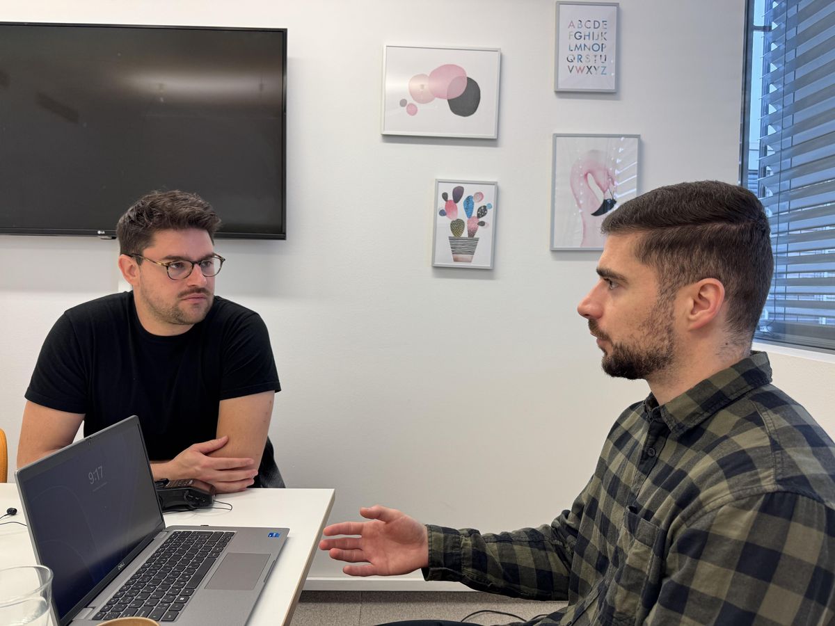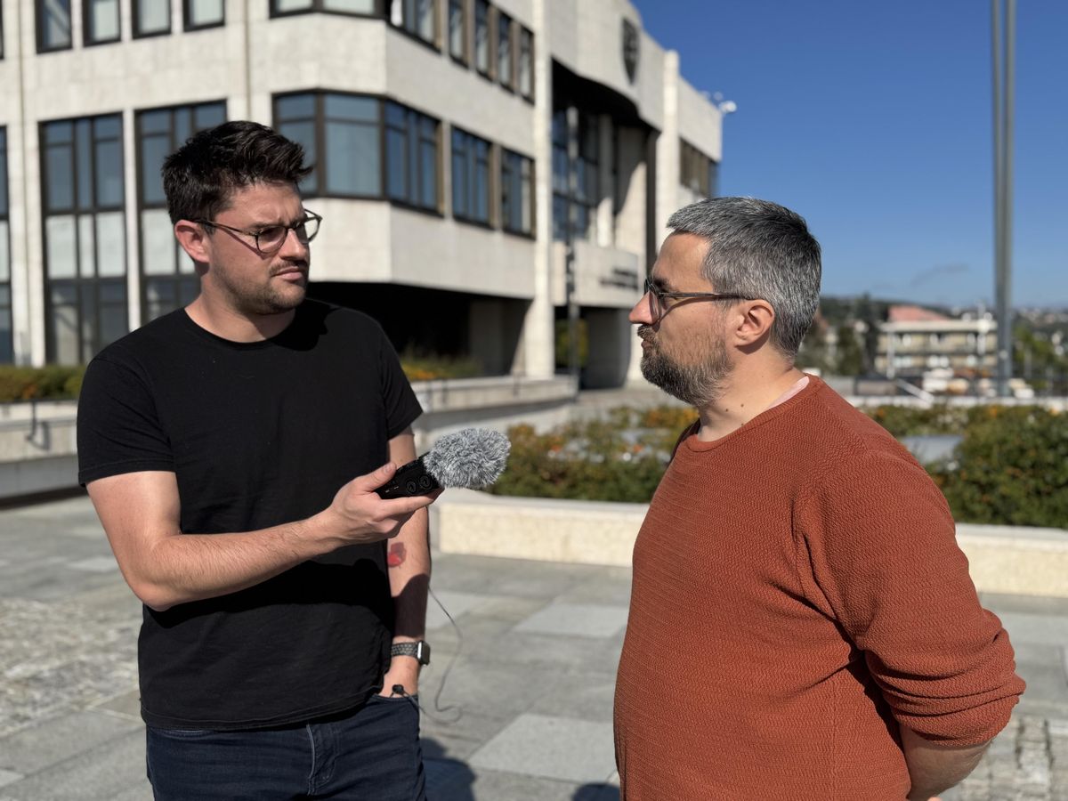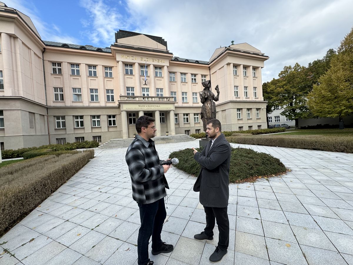 Martin Hodás a Filip Harzer při rozhovoru před sídlem Matice slovenské ve městě Martin.