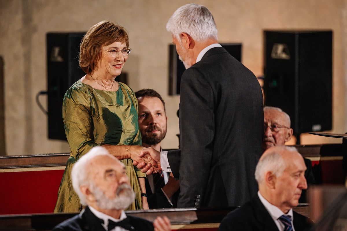 28. října 2025. Profesorka Jiřina Bartůňková přebírá Medaili za zásluhy z rukou prezidenta Petra Pavla.