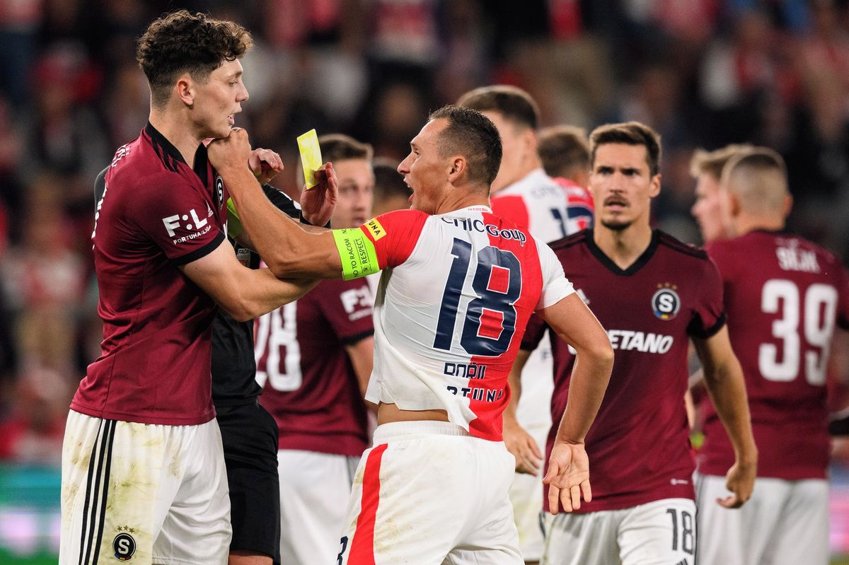 Nejslavnější kluby ve válce. Kapitáni Ladislav Krejčí (vlevo) a Jan Bořil předvedli nenávistnou rivalitu v září 2023.