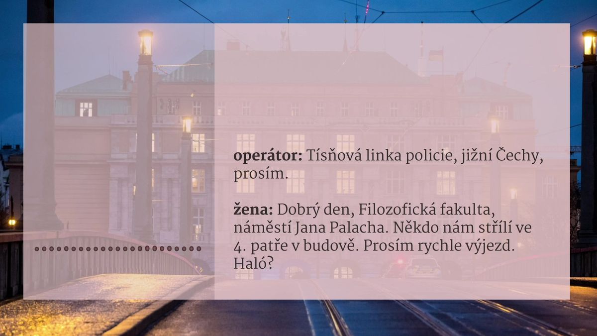 „A to je nějaké cvičení, nebo je to doopravdy?“ ptal se operátor ženy, která byla v budově Filozofické fakulty Univerzity Karlovy v Praze a ohlašovala střelbu. „Někdo nám střílí ve čtvrtém patře v budově. Prosím, rychle výjezd,“ oznamovala na linku 158.