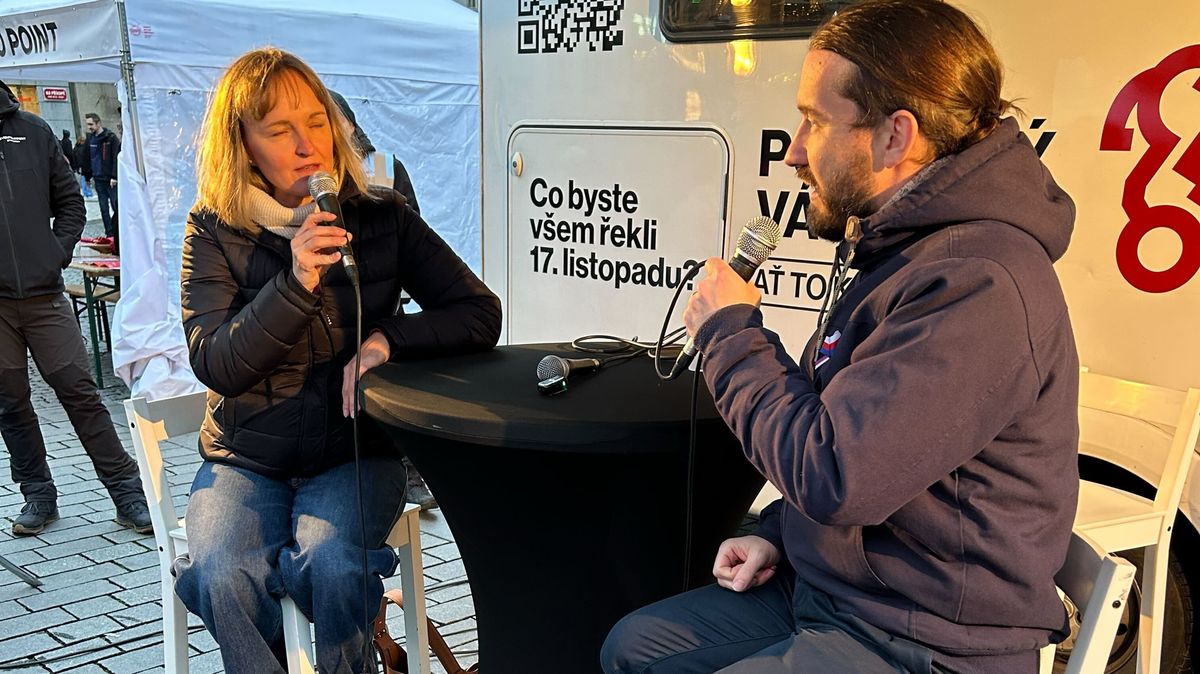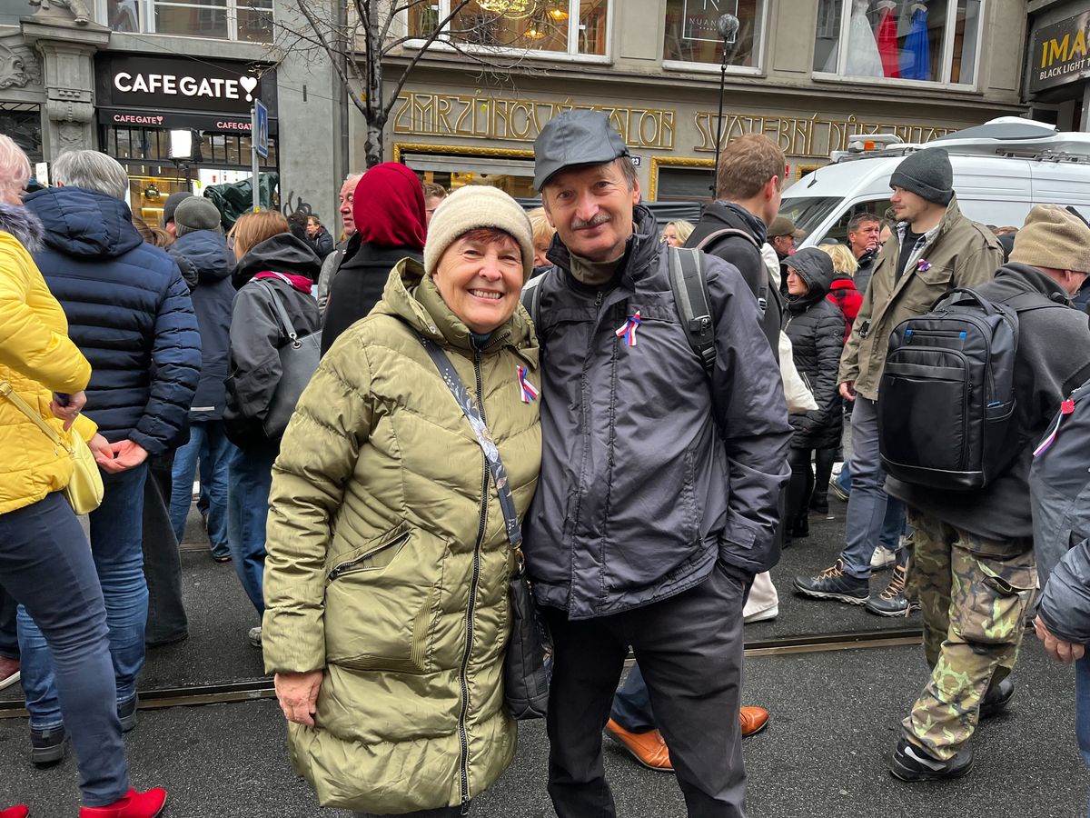 „Jsme z Moravy a jezdíme do Prahy každý rok připomenout si konec totality. Dneska jsme vstávali o půl čtvrté ráno, abychom tady byli co nejdřív,“ pyšní se manželé Otrusinovi, kteří společně zapálili svíčku pod pamětní deskou. „V roce 1989 jsme se zúčastnili protestů na Letné 25. listopadu s dalšími stovkami tisíc lidí. Je to nezapomenutelná vzpomínka,“ vzpomíná dvojice.