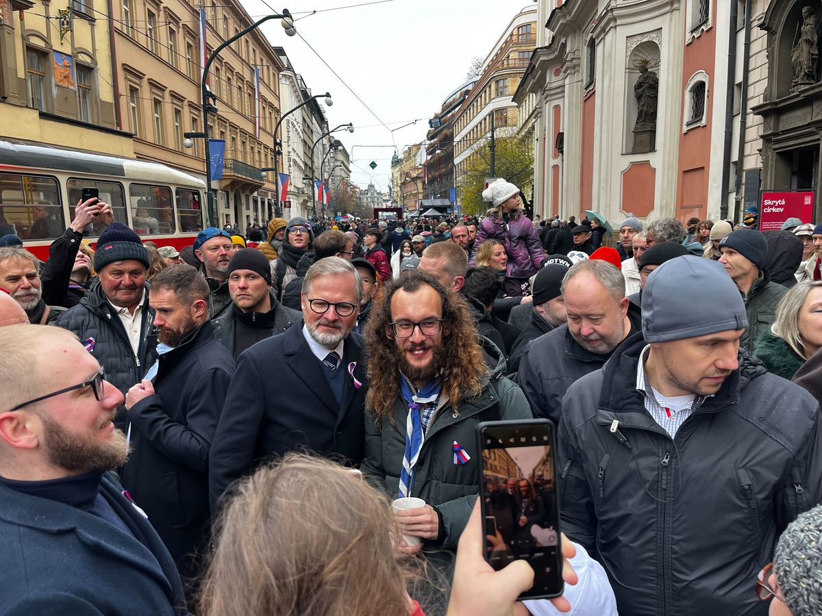 Premiér v demisi Petr Fiala (ODS) nemá radost z toho, co se nyní v České republice odehrává. Řekl to novinářům při oslavách 17. listopadu na Národní třídě v Praze. Kritizoval například předsedu Sněmovny Tomia Okamuru (SPD), který se podle něj přiklání k extrémním názorům nebo pravděpodobného budoucího premiéra Andreje Babiše (ANO) mimo jiné za údajnou spolupráci s někdejší komunistickou Státní bezpečností.