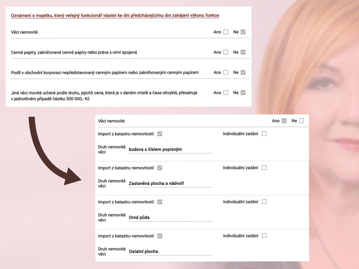 V přiznání musí každý politik nebo vysoce postavený úředník uvést, co v době nástupu do funkce vlastní. Jestli má nějaké nemovitosti, automobil, zda vlastní akcie nebo má dluhy - splácí například hypotéku nebo úvěr. Pokud v něm neuvedou informace přesně nebo je neuvedou vůbec, tak za to hrozí pokuta. Ta může být od jednoho do padesáti tisíc korun.