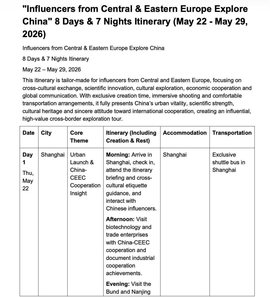 „Shshan“ přiložil i itinerář akce, k němuž napsal, že vše je hrazeno - cestování, ubytování i další náklady. „Program je navržen tak, aby prostřednictvím poutavých aktivit, času věnovaného kreativnímu tvoření a pohodlného cestovního programu zdůraznil městskou vitalitu Číny, vědecký pokrok, kulturní dědictví a odhodlání k mezinárodní spolupráci,“ nabízel osmidenní cestu od Šanghaje po Ťi-nan.