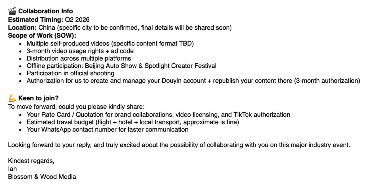 Další „nábor“ se v Česku pokouší provádět manažer „Ian“ z organizace Blossom & Wood Media. V tomto případě přichází s nabídkou zaplatit českým postavám TikToku výlet na automobilový veletrh do Pekingu. Představuje si, že tam influenceři z Česka natočí sérii videí, jejichž obsah Blossom & Wood Media dodá.