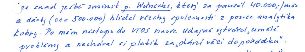 „Za paušál 40 tisíc měsíčně a dárky (cca 500 tisíc) hlídal všechny společnosti z pozice analytika Kobry,“ psal Výmola v dopise z vězení o svém vztahu s Wünschem policistům, když se snažil o mírnější trest za spolupráci. Reportéři mají listinu k dispozici.