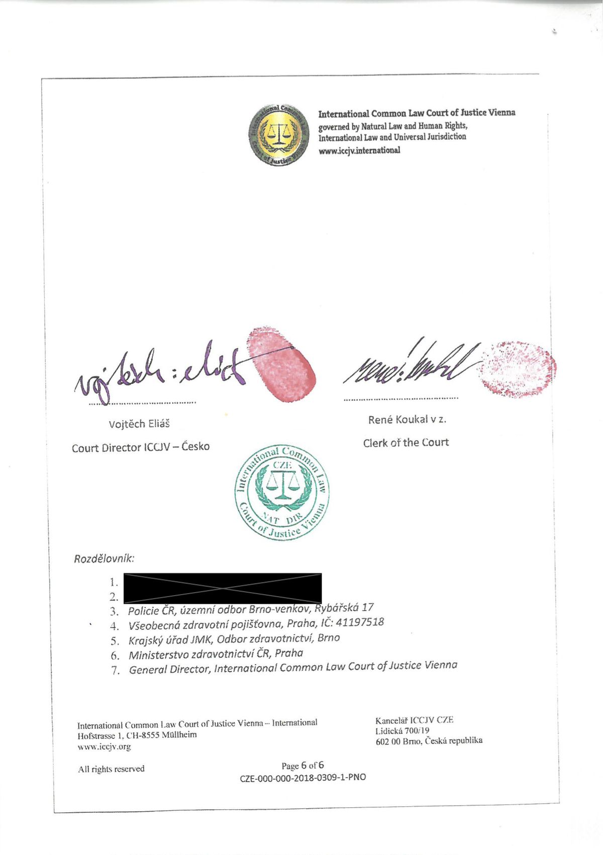 „Policejní orgán má za to, že v daném případě je jednání uvedených osob vystupujících jako zástupců ICCJV, tj. Vojtěcha Eliáše a Reného Koukala, potažmo úkon, který učinili, tj. vydání předmětného ‚rozsudku‘, způsobilý k naplnění znaků skutkové podstaty přečinu osvojení pravomoci úřadu,“ stojí v policejním dokumentu o ukončení případu, pod kterým je podepsaná komisařka Renata Brandejsová z oddělení hospodářské kriminality brněnské policie.