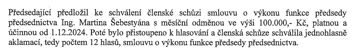 Ze zápisu zasedání spolku: Stotisícový plat šéfové velkých zemědělských firem schválili předloni v listopadu Šebestyánovi jednohlasně. Předtím šéfoval zemědělskému fondu, který jim posílal miliardové dotace.