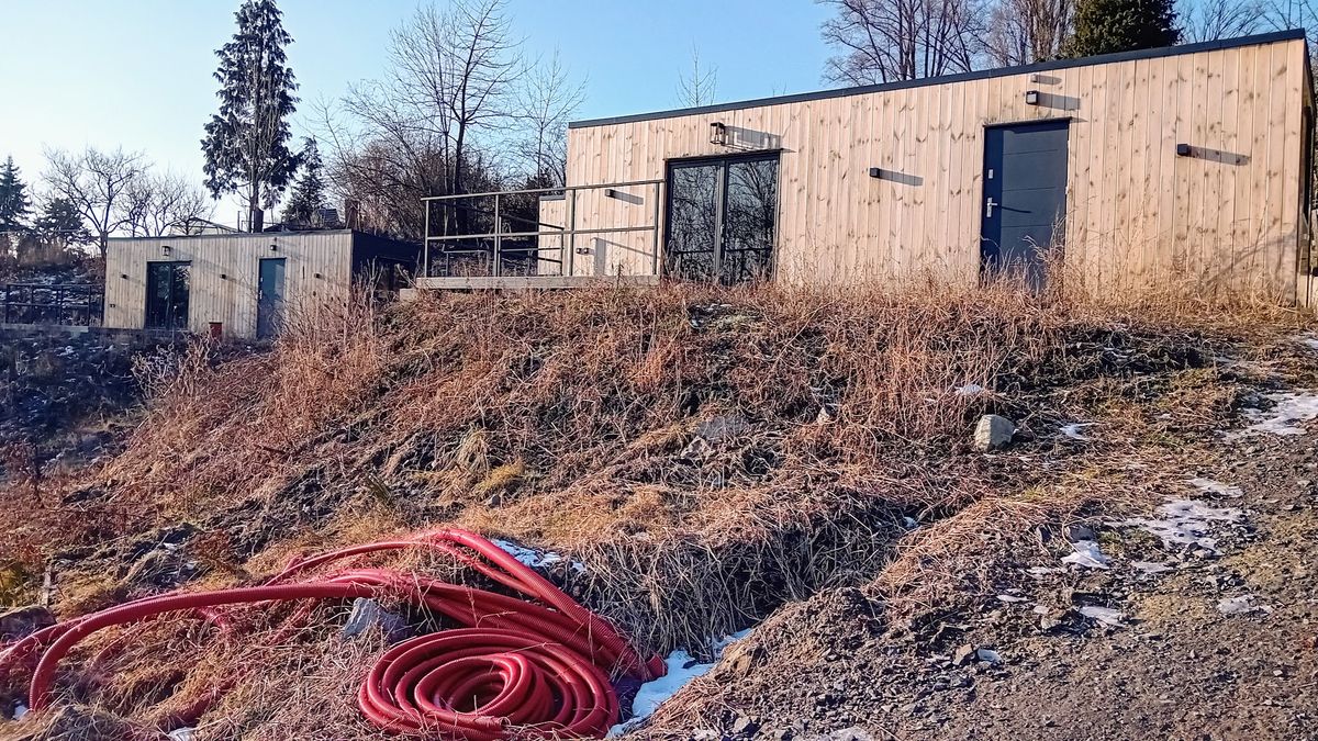 Obytné kontejnery (bungalovy) v České Kamenici. Zatím jsou na místě čtyři, celkem jich má být podle pronajímatele areálu sedm. Každý má kuchyňku, sociální zařízení a venkovní terasu. Vše, co je nad zemí, má zaplatit soukromník, inženýrské sítě město. Na přilehlém pozemku má být posléze vybudována ještě plocha pro karavany a stanování.