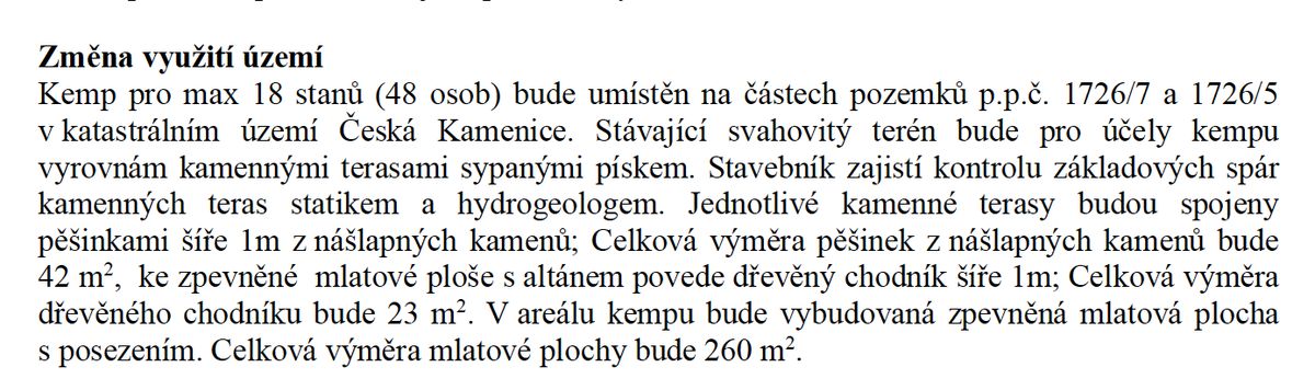 V tomto dokumentu, který mají Seznam Zprávy k dispozici, se píše, že nový kemp má být „pro maximálně 18 stanů (48 osob)“. Nic o obytných kontejnerech tam není (viz níže).