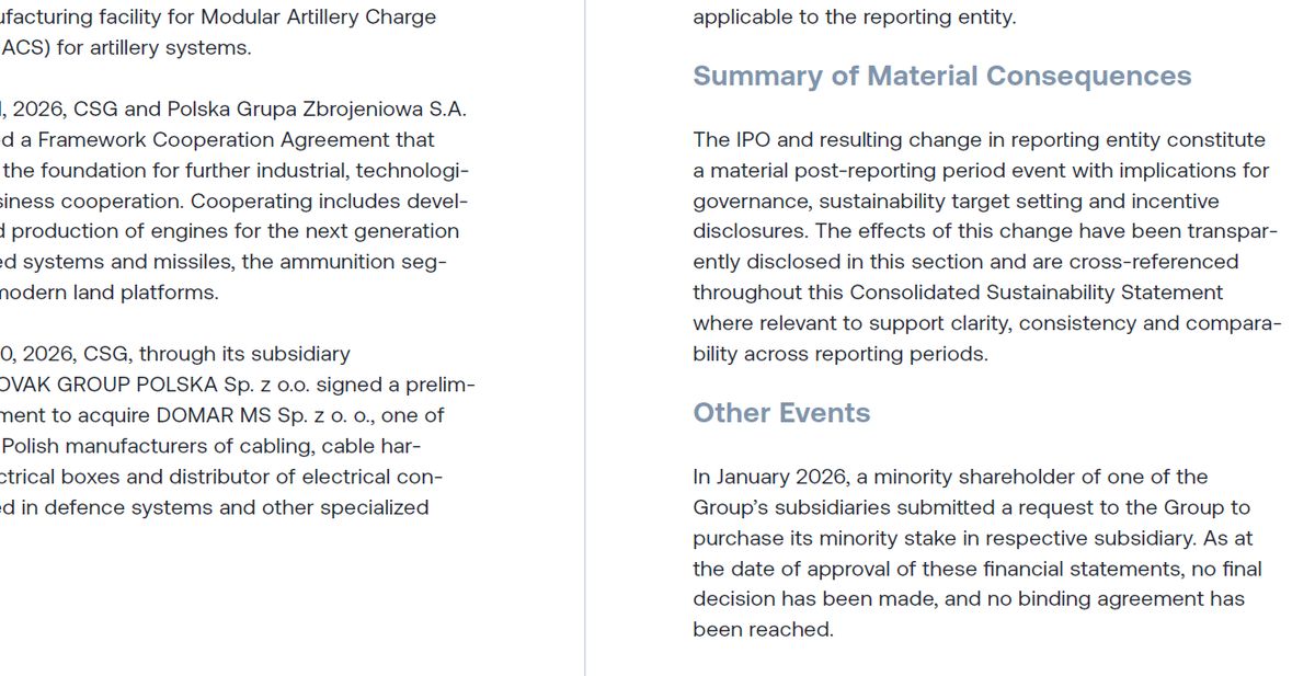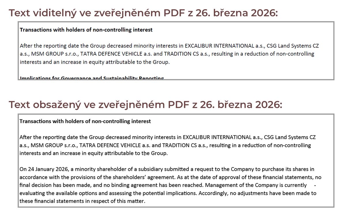 Skrytý odstavec v českém překladu zní: „Dne 24. ledna 2026 předložil menšinový akcionář dceřiné společnosti Společnosti žádost o odkoupení svých akcií v souladu s ustanoveními akcionářské smlouvy. Ke dni schválení této účetní závěrky nebylo učiněno žádné konečné rozhodnutí a nebyla uzavřena žádná závazná dohoda. Vedení Společnosti v současné době vyhodnocuje dostupné možnosti a posuzuje potenciální dopady. V souvislosti s touto záležitostí proto nebyly v této účetní závěrce provedeny žádné úpravy.“