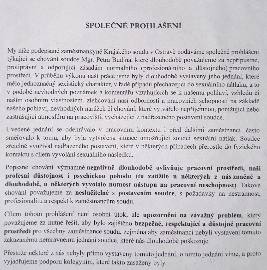 „V průběhu výkonu naší práce jsme byly dlouhodobě vystaveny Budínovu jednání, které mělo jednoznačný sexistický charakter, v řadě případů přecházející do sexuálního nátlaku,“ uvádějí ve společném prohlášení pracovnice ostravského krajského soudu. Redakce má prohlášení k dispozici i se všemi devadesáti podpisy.
