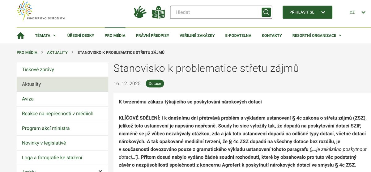 „Stanovisko k problematice střetu zájmů ze dne 16. prosince 2025 vypracoval Ing. Jiří Felčárek, současný ředitel Odboru kanceláře ministra. Vypracování stanoviska bylo zadáno ústním pokynem ministra zemědělství,“ přišla Seznam Zprávám odpověď, kterou jako šéf ministrovy kanceláře podepsal samotný Jiří Felčárek. S tím, že zveřejnění jím vypracovaného stanoviska k Agrofertu nařídil také ministr Šebestyán