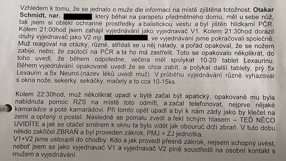Policejní vyjednavač pár minut před střelbou hovoří s Otakarem Schmidtem. Záznam pochází z kamery jednoho ze zasahujících policistů. Redakce video zveřejňuje se souhlasem pozůstalých.Video: Seznam Zprávy