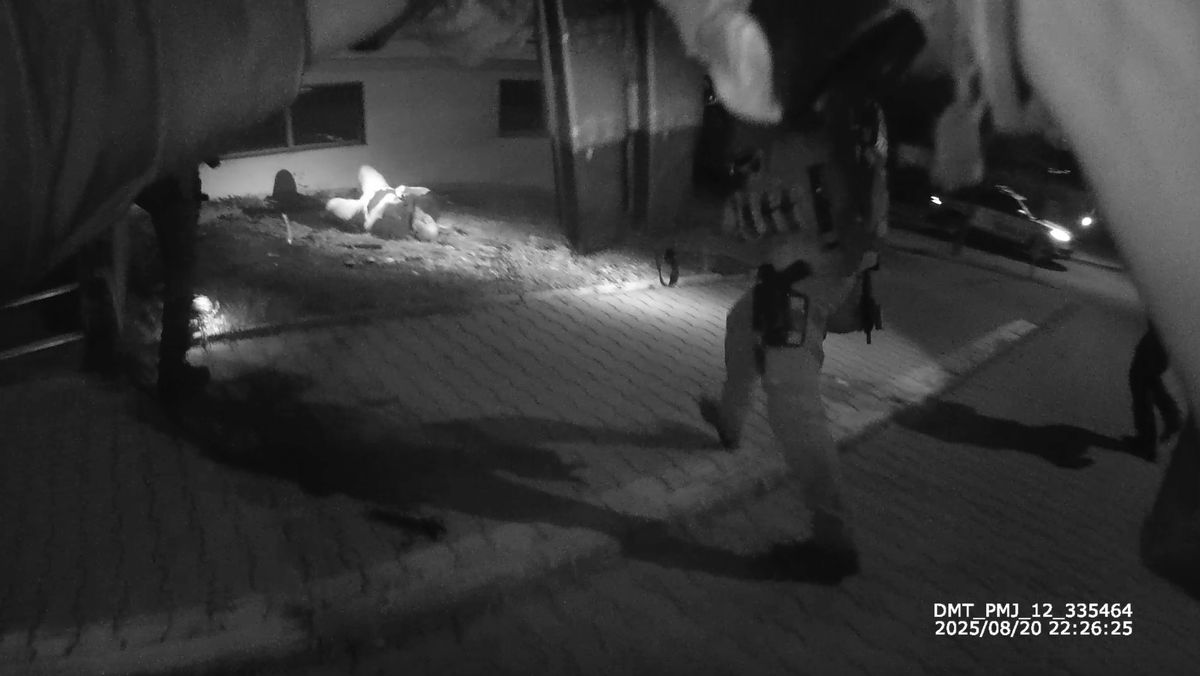 Pád ze zhruba dvoumetrové výšky ale příčinou mužových útrap není. „Dostal tou devítkou, nebo šest a půlkou?“ ptá se jeden z mnoha zasahujících policistů nositele kamery. „Já vůbec nevím, já nevím, kdo střílel…“ odpovídá mu.