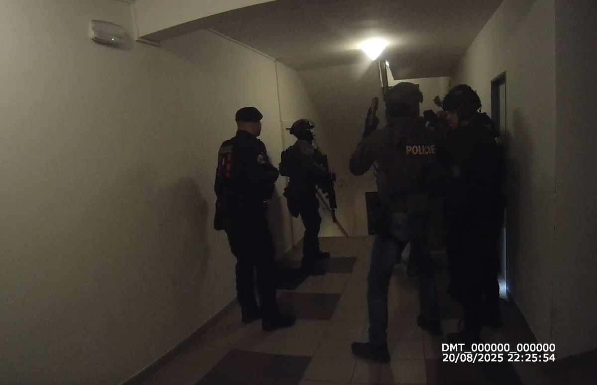 Když policisté dveře bytu konečně rozrazí, nejsou tam schopni kvůli pepřovému kouři vstoupit bez ochranné masky. „Tam nechoď, tam je humus. Vidět nic není. Je tam kouř,“ upozorňuje jeden z příslušníků kolegu. Další vyzývá ostatní, aby si šli pro ochranu dýchacích cest.