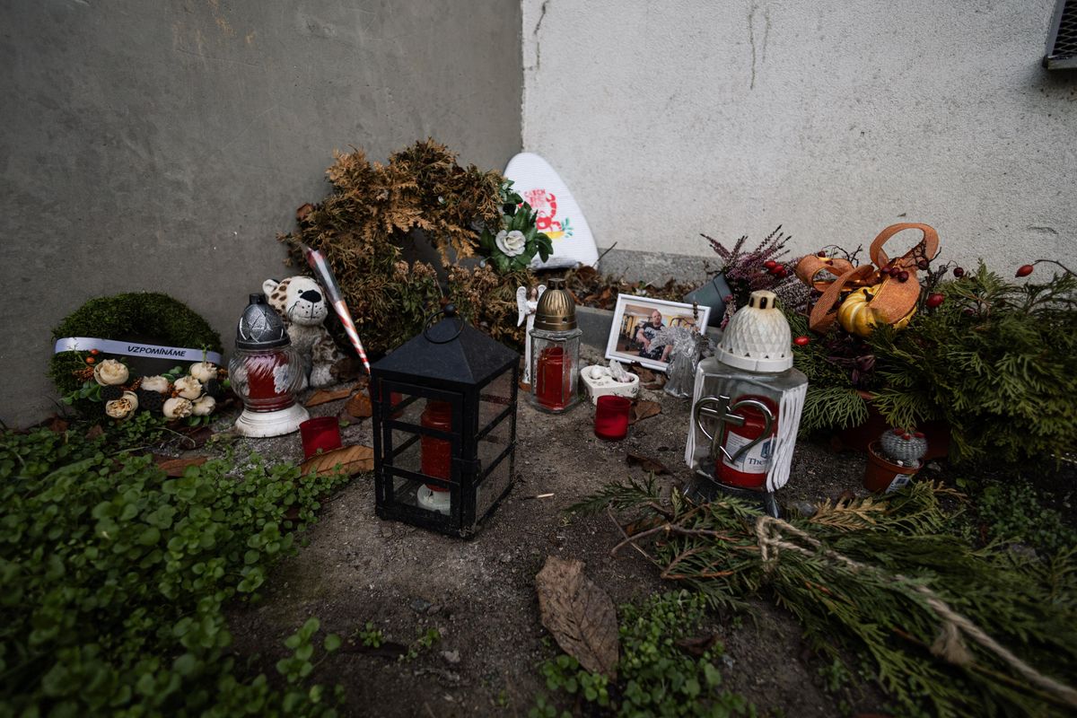 Improvizované pietní místo pod oknem Schmidtova bytu.