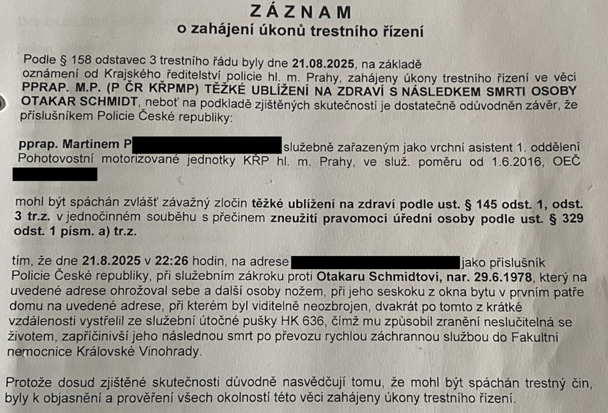 „Při služebním zákroku proti Otakaru Schmidtovi, který ohrožoval sebe a další osoby nožem, při jeho seskoku z okna bytu v prvním patře domu, při kterém byl viditelně neozbrojen, vystřelil Martin P. dvakrát z krátké vzdálenosti ze služební pušky, čímž mu způsobil zranění neslučitelná se životem,“ popisuje dále v interním dokumentu vyšetřovatel, podle nějž „dosud zjištěné skutečnosti důvodně nasvědčují tomu, že mohl být spáchán trestný čin“.