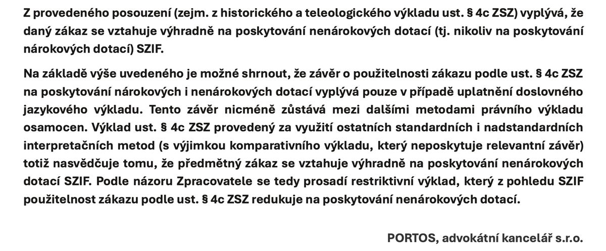 „Jinými slovy – předmětná ustanovení správních soudů neposkytují argumentační základ k učinění závěru, že ustanovení se na poskytování nárokových dotací nevztahuje. Je tedy třeba v současnosti vycházet z předpokladu, že ustanovení dopadá na poskytování nárokových i nenárokových dotací zemědělského fondu,“ uvedli jednoznačně experti z Portosu.
