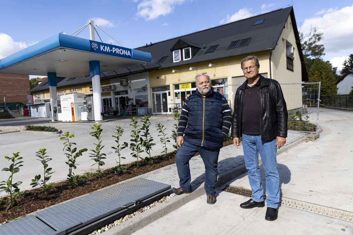 Kameničtí opoziční zastupitelé Jan Jedlička (vlevo) a Pavel Šotola u nového stáčecího místa PHM. Tam teď zajíždějí autocisterny a pokračují kolem pumpy po nové objízdné trase.