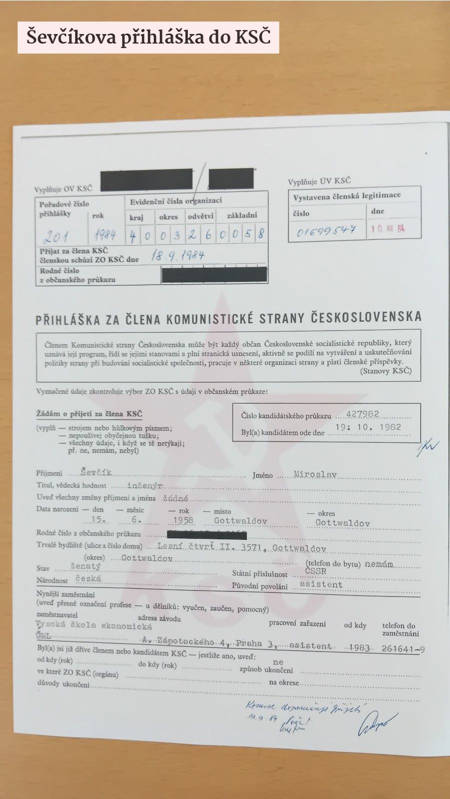 Když však 21. června 1984 žádal o vstup do KSČ, formuloval svoje postoje jinak. „Přihlášku za člena strany (KSČ) podávám s tím, že bych chtěl přispět svou prací, odbornými znalostmi k prosazování její politiky pro blaho celé společnosti,“ stojí v dokumentu, který Seznam Zprávy nyní získaly na vyžádání z Národního archivu.