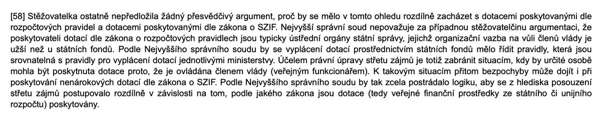 „Podle Nejvyššího správního soudu by zcela postrádalo logiku, aby se z hlediska posouzení střetu zájmů postupovalo rozdílně v závislosti na tom, podle jakého zákona jsou dotace (tedy veřejné finanční prostředky ze státního či unijního rozpočtu) poskytovány,“ dodává verdikt.