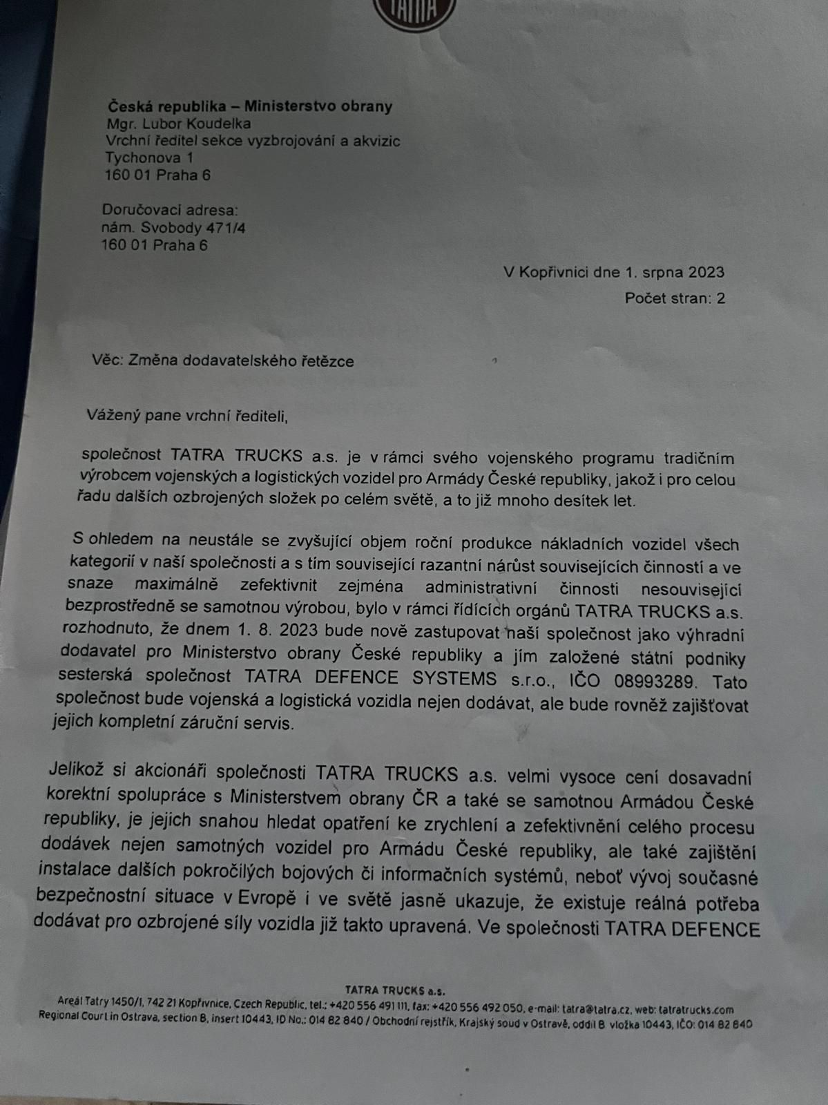 Jenže v srpnu 2023 se management firmy Tatra Trucks rozhodl k překvapivému kroku. Sám od sebe požádal Ministerstvo obrany, aby přestalo nakupovat vozy od firmy, která je vyrábí, a uzavřelo smlouvu se společností jinou. Dopis odeslaný v srpnu 2023 se jmenuje Změna dodavatelského řetězce a management Tatry navrhuje vrchnímu řediteli sekce vyzbrojování Ministerstva obrany Lubomíru Koudelkovi, aby se zbavil smlouvy s jejich firmou a uzavřel novou se společností Tatra Defence Systems (TDS). Tato společnost, ač má slovo Tatra ve jméně, ve skutečnosti do skupiny nepatří a samotná automobilka v ní podíl nemá. Ovládá ji holding CSG zbrojaře a miliardáře Michala Strnada, který je současně i většinovým majitelem samotné Tatra Trucks. V té je ale – na rozdíl od TDS – ještě další společník.
