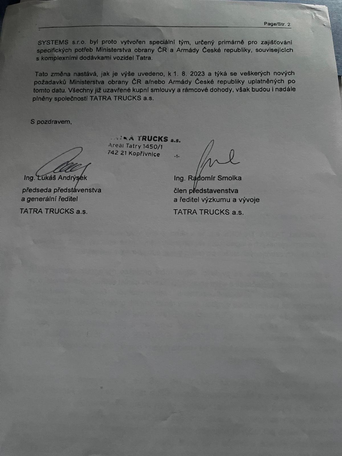 Druhá strana dopisu, v němž Tatra Trucks oznamuje změnu dodavatelského řetězce.