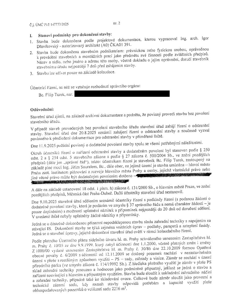 „Stavební úřad shledal, že obě stavby byly provedeny v rozporu se stavebními zákony, to jest bez příslušných opatření, čímž se stavebník dopustil přestupku proti stavebnímu řádu, který bude předmětem přestupkového řízení,“ stojí v odpovědi, pod kterou je podepsán Aleš Cejnar, tajemník Úřadu městské části Praha 15.