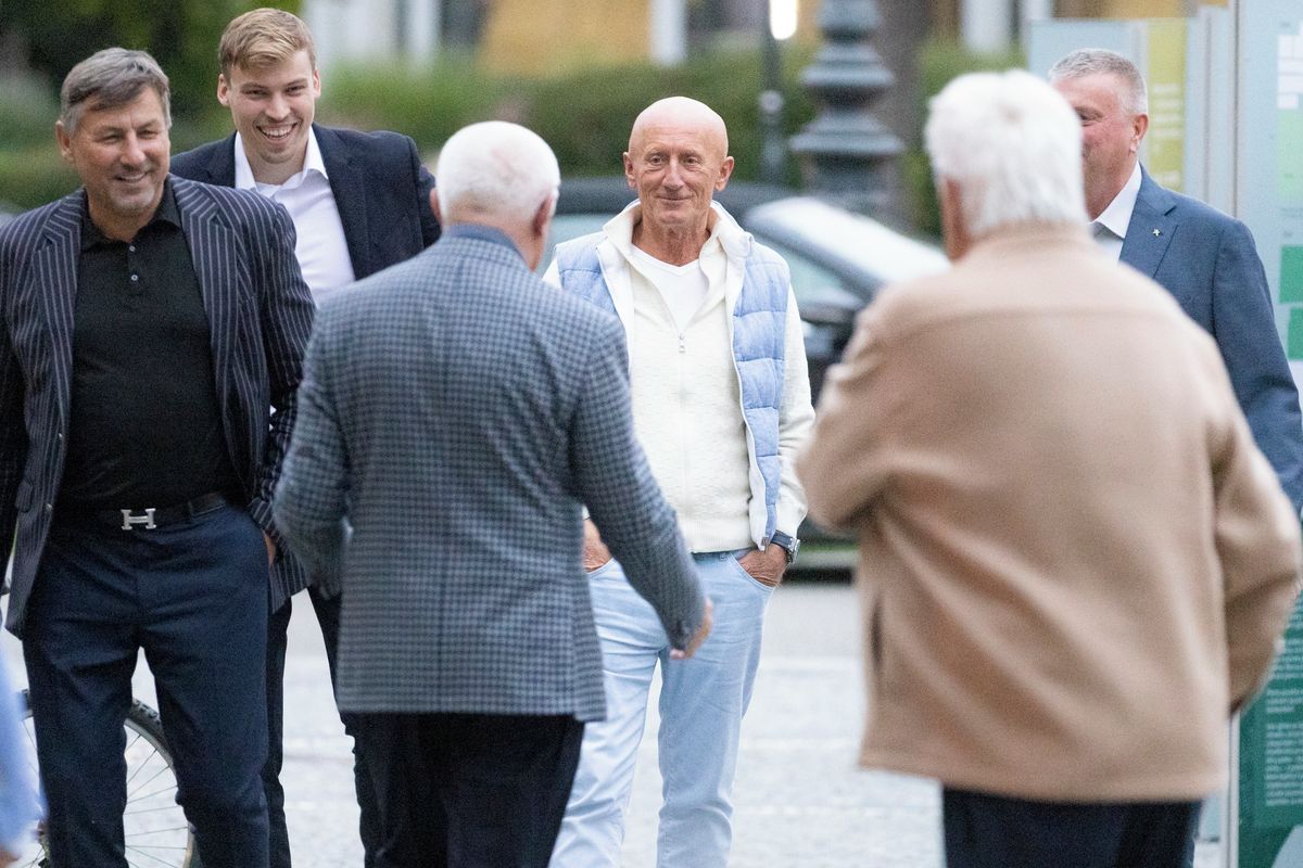 Scéna z loňské Faltýnkovy vernisáže v Prostějově: Hostitel v saku vítá příchozí. Zcela vlevo Vladimír Melas (alias Velký Vlado) a za ním jeho starší syn Dávid, šéf sítě vysokých škol.