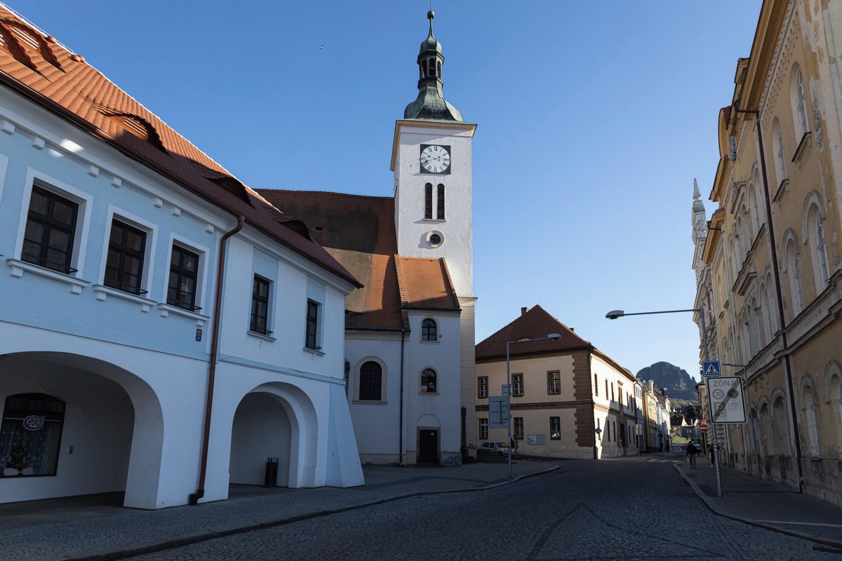 Dům s obecními byty (nalevo), v němž patnáct let, do letošního jara, současná ministryně Mrázová bydlela. Dům stojí hned vedle kostela ze 14. století, v pozadí je vidět dominanta oblasti – vrch Bořeň.