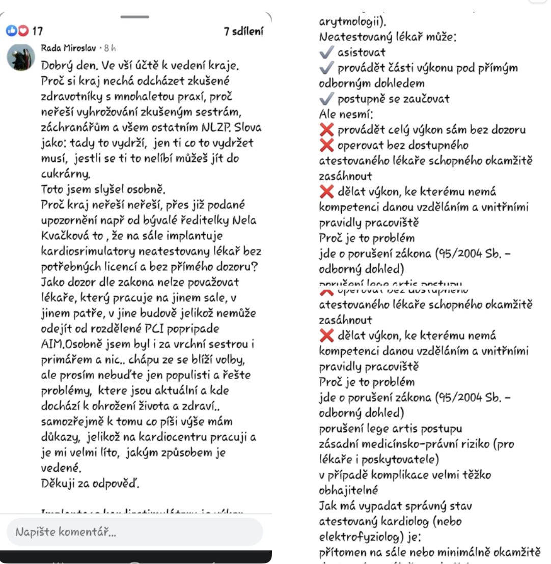 „Na sále implantuje kardiostimulátory neatestovaný lékař bez potřebných licencí a bez přímého dozoru,“ popsal své zkušenosti z karlovarského kardiocentra, kde působí (viz níže kopie příspěvku).