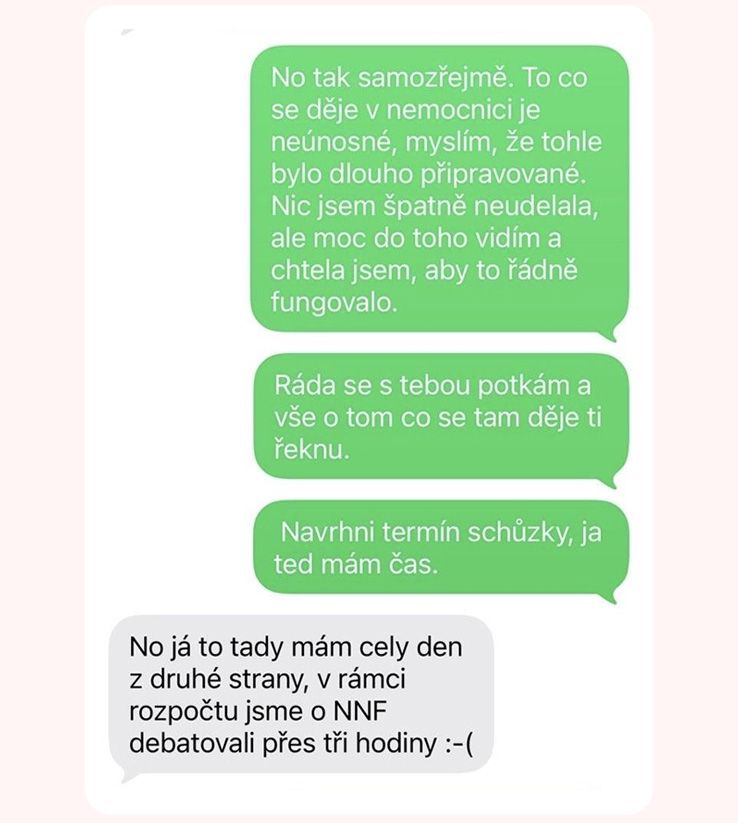 Zároveň upozorňovala na to, že má nemocnice závažné problémy. „To, co se děje v nemocnici, je neúnosné, myslím, že tohle bylo dlouho připravované. Špatně jsem nic neudělala, ale moc do toho vidím a chtěla jsem, aby to řádně fungovalo. Stala jsem se nepohodlnou,“ popisovala radnímu před třemi lety Veselá.