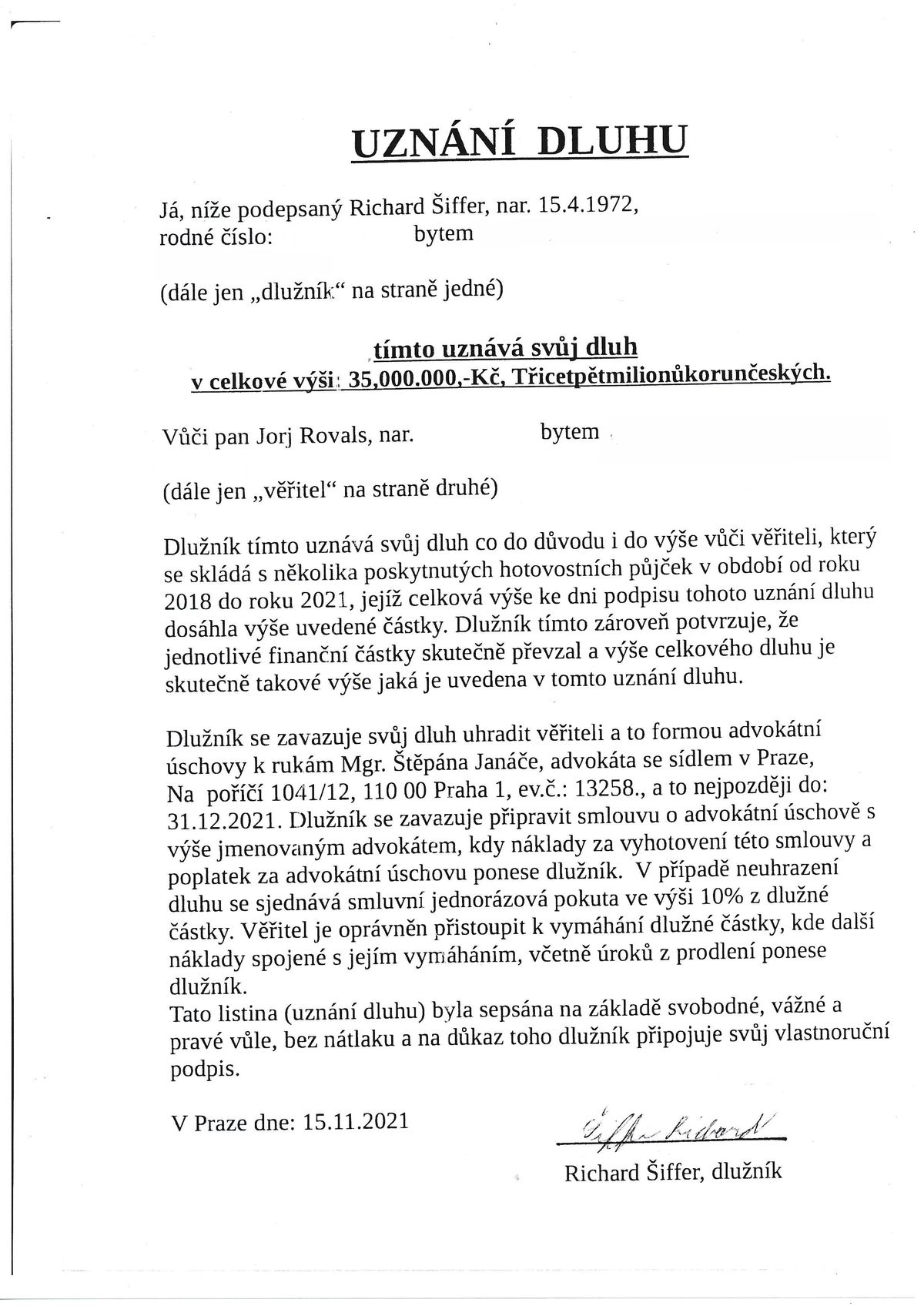 V dokumentu z roku 2021 o uznání dluhu, který Seznam Zprávy získaly a na kterém je úředně ověřený podpis Richarda Šiffera, stojí, že si 35 milionů korun od kadeřníka půjčoval v letech 2018-2021.