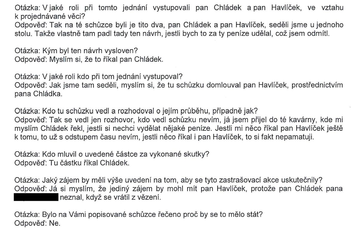 Výsek z falešné policejní výpovědi. Jan Mach policistům sděluje, že zastrašovací akce, tedy střelby na domy advokátů a podnikatelů z Jihlavska, si objednal Jan Havlíček. Zmiňovaný Milan Chládek již zemřel, s Hladkým podle Macha skupinu řídil.