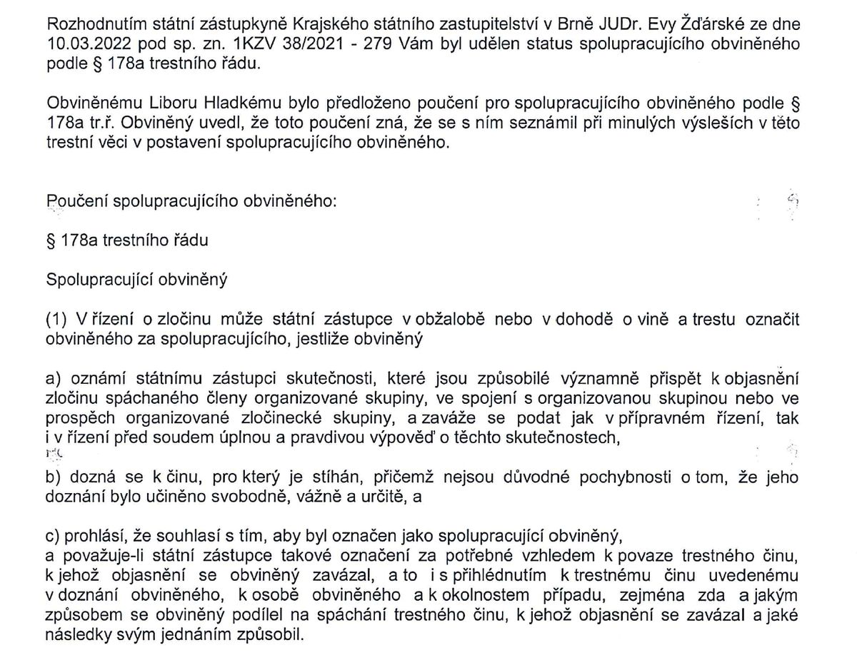 Status spolupracujícího obviněného, který žalobkyně Eva Žďárská udělila Hladkému na začátku roku 2022, ho zavazuje k „úplné“ a „pravdivé“ výpovědi.