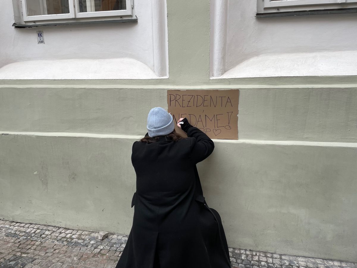 Mezi demonstranty zamířily i dvě studentky z Jablonce s rodiči. Na poslední chvíli ještě dopisovaly na karton transparent. „Babiš se vyhýbá zákonům. Zákony ale platí pro všechny,“ zdůrazňuje jedna ze sester. „Nelíbí se nám, že ministr Macinka vydírá našeho prezidenta, který se chová noblesně,“ dodává druhá.