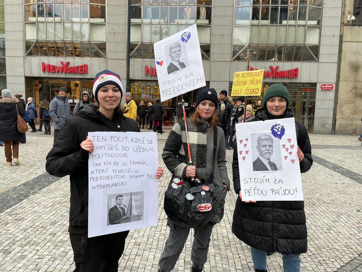 „Jsme tu za budoucnost. Aby nám vládl někdo, kdo vyhrožuje prezidentovi, to je pro nás nepřijatelné,“ shodují se těsně před zahájením demonstrace tři studentky z Pardubic. Z Václavského náměstí pak mířily na nedaleký „Staromák“, který se těsně před třetí hodinou zaplnil doslova do posledního místa.