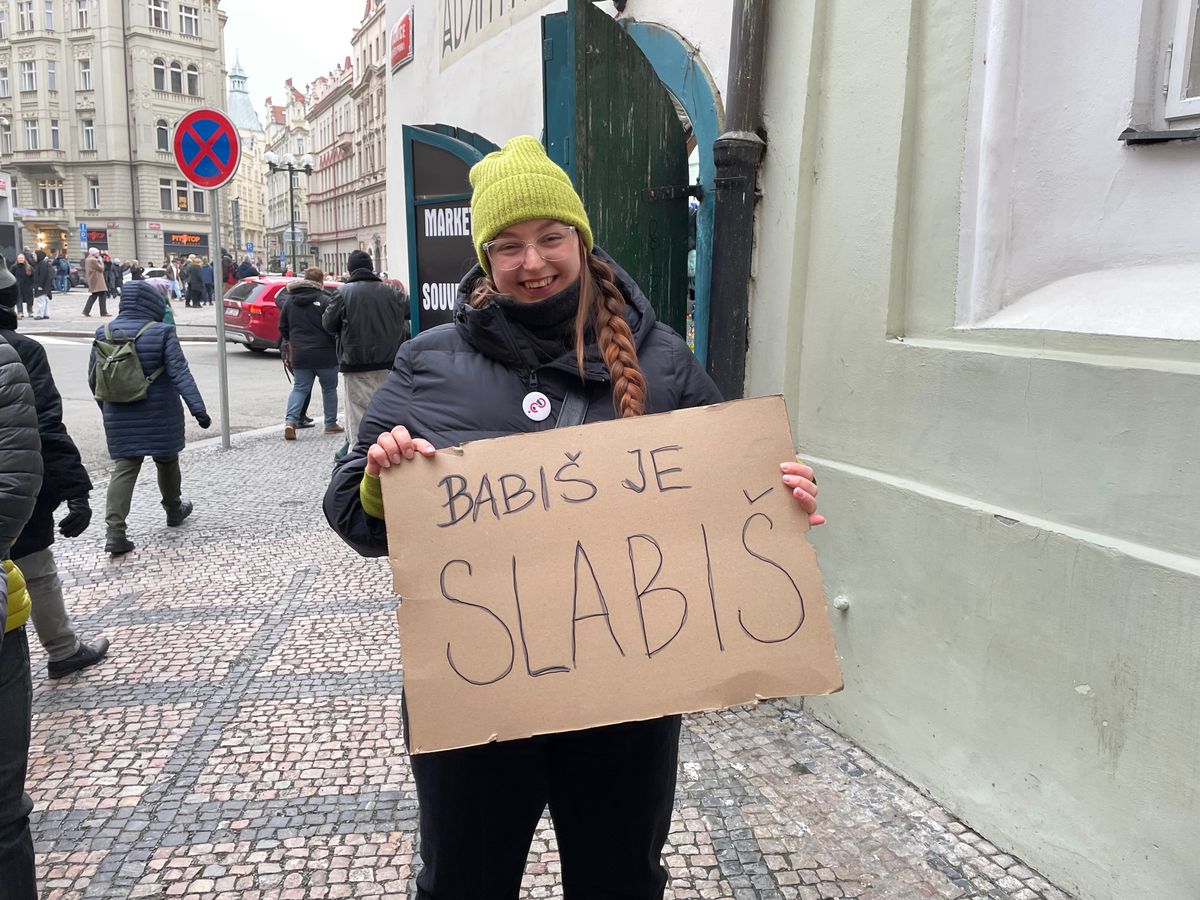 Mrazivé počasí neodradilo v cestě do centra metropole ani osmdesátiletou Věru Malou z Prahy. A to i přesto, že s přítelkyněmi hraje každou neděli odpoledne karty. Dnes ale teplo vršovického bytu vyměnila za studené Staroměstské náměstí. „Kanasta počká, budoucnost vnoučat má jasně přednost,“ říká a v ruce drží papírovou českou vlajku. „Fotit se vám nebudu, ale klidně tam napište, že toho Turka ve vládě nechci. Horší je ale Okamura, na toho bychom si měli dát bacha,“ vzkazuje.