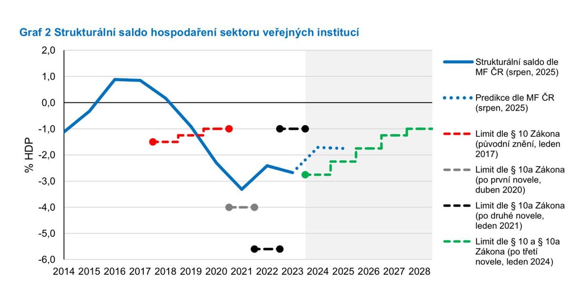 Strukturální schodek – tedy manko mezi příjmy a výdaji po očištění o příznivé či škodlivé výkyvy v hospodářském cyklu – se má zlepšovat z 2,75 procenta v roce 2024 každý rok o půl bodu. V roce 2028 má dosáhnout původního jednoho procenta. To všechno v zákoně pořád je.