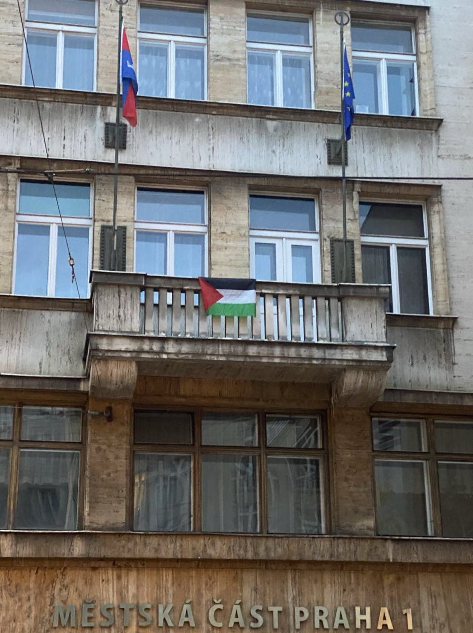 Palestinská vlajka se letos v květnu objevila i na budově radnice Prahy 1. Vyvěsili ji tam neznámí aktivisté.