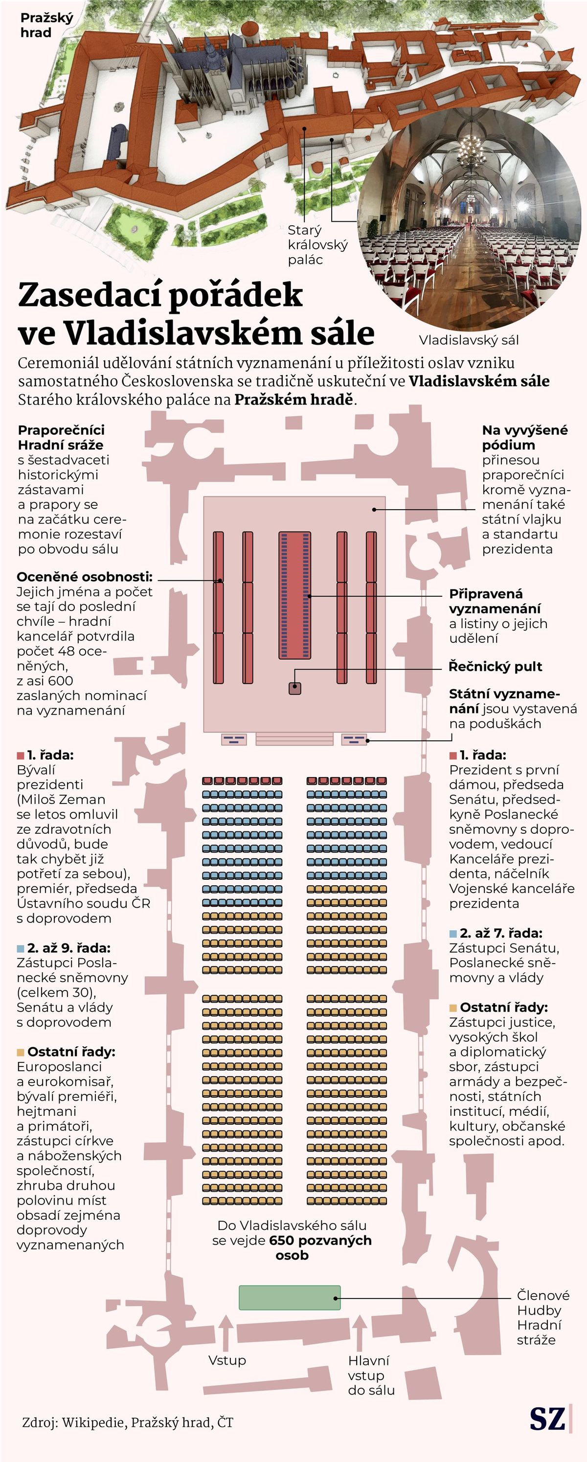 Jako nejprestižnější slavnostní prostor sídla prezidenta je spjat i s nejvýznamnějšími ceremoniemi státu. U příležitosti výročí vzniku republiky 28. října jsou na slavnost pozváni nejen ti, kterým prezident udělí státní vyznamenání, ale i zástupci nejvyšších pater politiky, diplomacie, justice či akademické sféry. Pro všechny už je tradičně v sále připraven přesný zasedací pořádek. Podívejte se v grafice, kde kdo usedne na předávání státních vyznamenání.