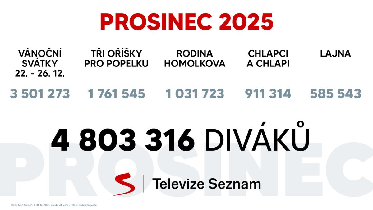 Televize Seznam navýšila v prosinci v meziročním srovnání svůj podíl ve sledovanosti o téměř 21 procent. Na trhu tuzemských televizních stanic má tak aktuálně share 2,78 procent. Svým prosincovým a vánočním programovým schématem zasáhla celkem 3,3 milionu diváků v cílové skupině 18 až 69 let, respektive 4,8 milionu diváků v cílové skupině starší čtyř let. O Vánocích se stala čtvrtou nejsledovanější tuzemskou stanicí.