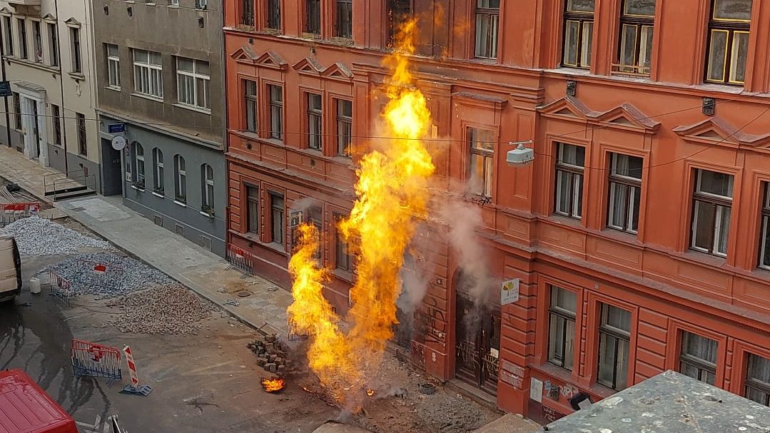 Hasiči byli přivoláni k požáru kolem 14:00 a na místo podle Řezáče směřovaly jednotky ve druhém stupni poplachu. Kolem 15:00 hasiči zvýšili stupeň poplachu na tři a ve spolupráci s plynárenskou pohotovostí pracují na uzavření plynu, doplnil mluvčí.